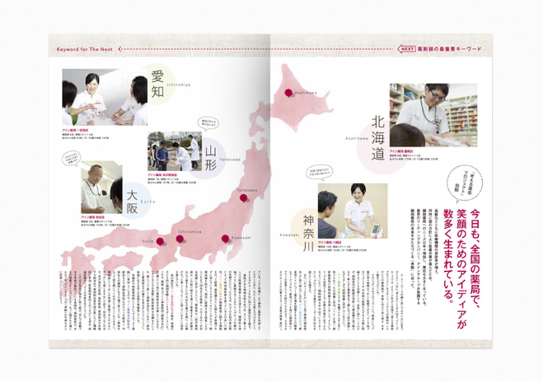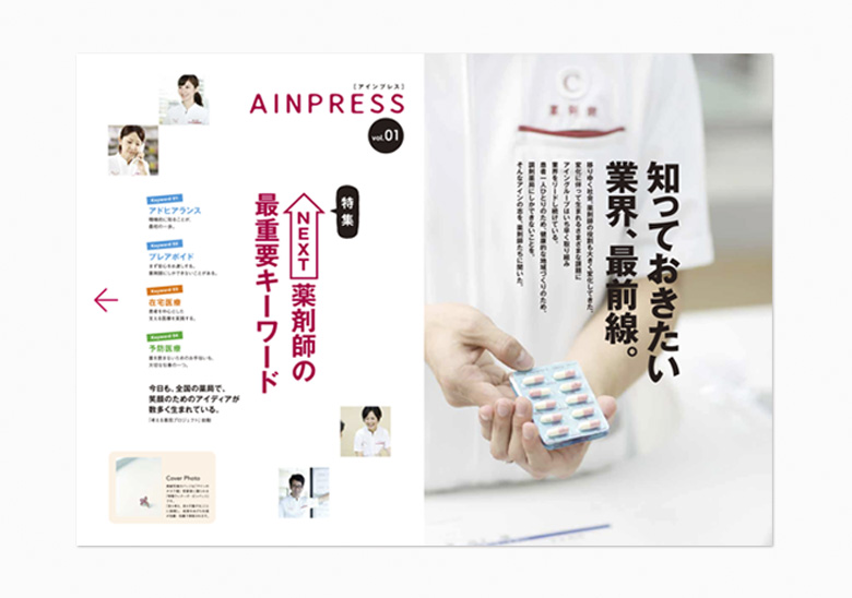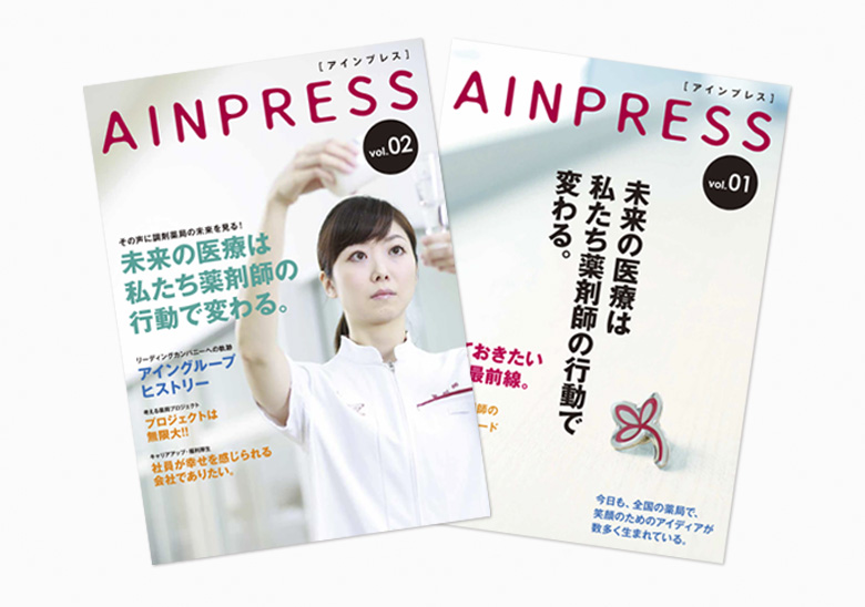 いままで紹介する機会がありませんでしたが、何年もの長い間アイングループ様のパンフレットなど多くのお仕事に携わらせていただいています。いまでは、日本を代表する調剤薬局グループに成長を遂げた企業なので関わる広告制作にはかなりのプレッシャーがありますが、つねに緊張感をもって取り組んでいます。今年度もリクルートパンフを制作させていただきました。薬剤師を目指す学生達が、この冊子を見てアイングループで働きたいと思ってくれると嬉しいです。